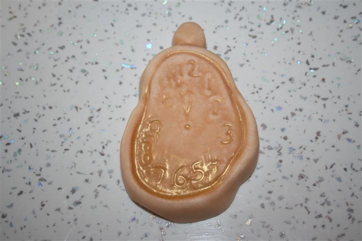 La forma è davvero carina si tratta di un orologio sciolto che ricorda quelli di Dalì, color arancio chiaro con la parte superiore ricoperta d’ oro. Mi piace l’ idea della forma legata al nome Per un’ ora d’ amore e associata allo scopo.