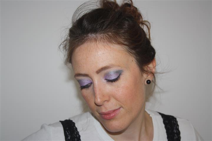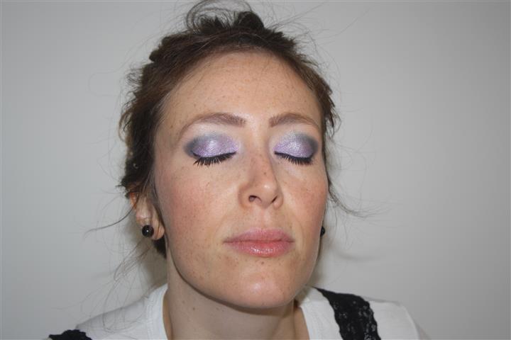 Su tutta la palpebra ho steso il viola metallico stupendo della Essence Disco Diva che ho sfumato nella piega con l’ ombretto grigio della Essence Pretty Rockin’. Sotto l’ arcata sopraccigliare ho applicato il solito Virgin nude della Naked.