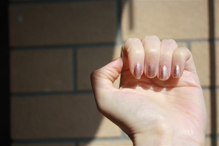 E’ oro puro, mi ricorda l’ oro rosa. A vederlo dalla boccetta, prima di provarlo non avevamo capito se fosse in realtà un vero smalto o un top coat.