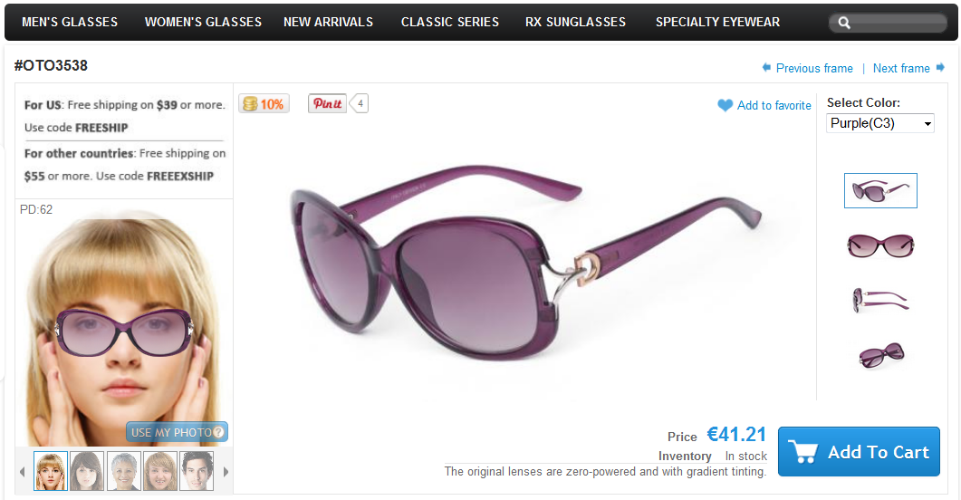 Non avendo mai acquistato occhiali on line mi sono resa conto di quanto possa essere difficile scegliere. Sul sito è presente l’ applicazione Virtual Try On, attraverso cui potrete caricare una foto del vostro viso e grazie ad un fotomontaggio scegliere il modello che realmente vi sta meglio o semplicemente vi piace di più.