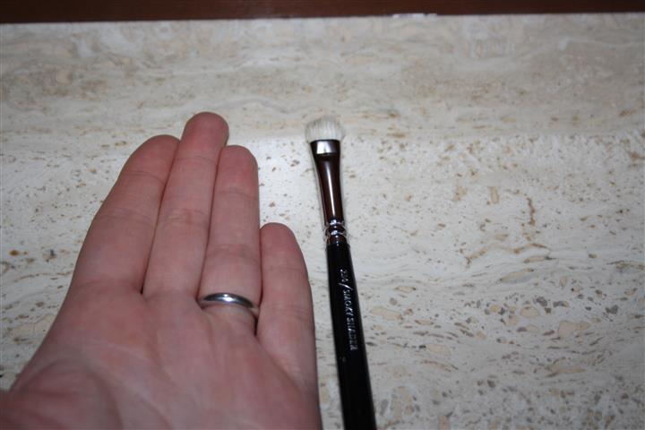 Noterete dall’ immagine che i peli formano una C che definirei arrotondata, io utilizzo questo pennello non tanto per applicare l’ ombretto sulla palpebra mobile o sotto le ciglia inferiori ma piuttosto per sfumare il colore chiaro sotto l’ arcata sopraccigliare o quello scuro nella piega. Se è utilizzabile perché pulito o almeno non troppo sporco è tra le mie prime scelte.