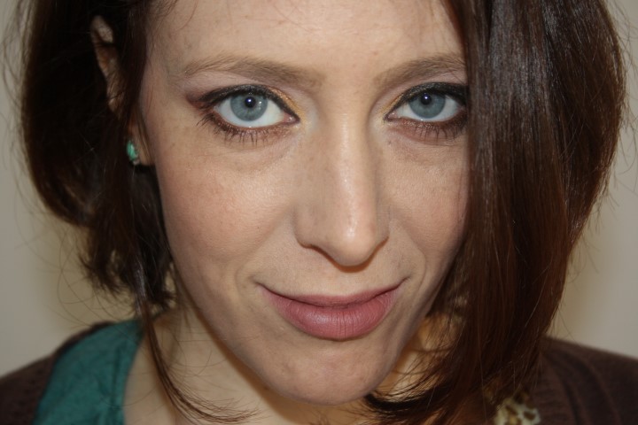 Nella prima parte dell’ occhio ho applicato l’ ocra Dharma, nella parte centrale il marrone bronzo shimmer Bollywood e nella piega il marrone scuro mat Maharaja.