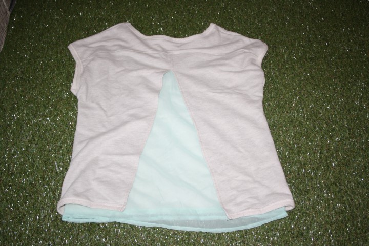 La mia amica Silvia mi ha regalato questa felpina con le maniche corte che ha la particolarità di avere questo spacco sul retro coperto da questo velo color verde acqua. Mi piace davvero molto l’ unione di stoffe diverse e se vi piace potete trovarla al’ ovs.