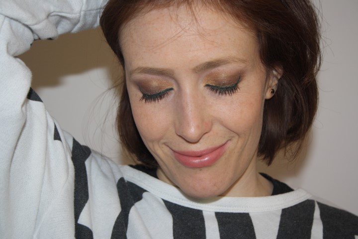 Nella prima parte dell’ occhio ho applicato Maharaja della palette India di Paola P un giallo dorato a cui ho abbinato il duochrome Veleno di Neve un verdone con riflessi marroni che ho sfumato verso l’ esterno. Al centro della palpebra dove è meno sfumato risulta più verde mentre all’ estrno viene fuori il marrone.