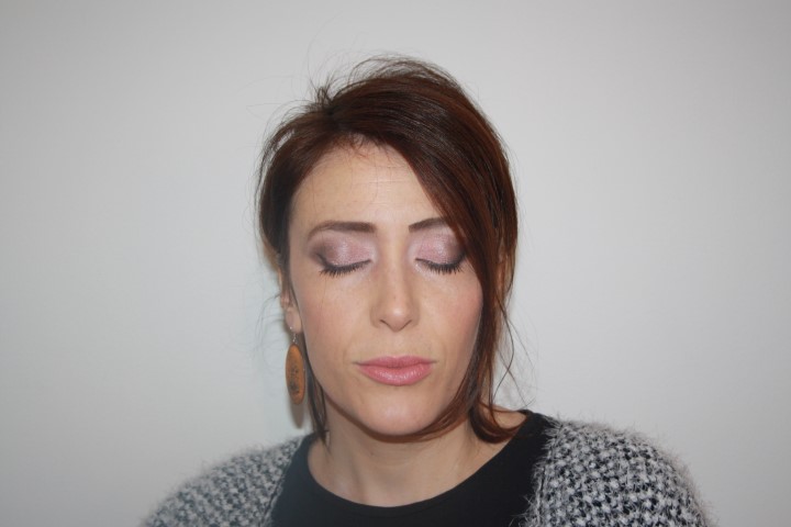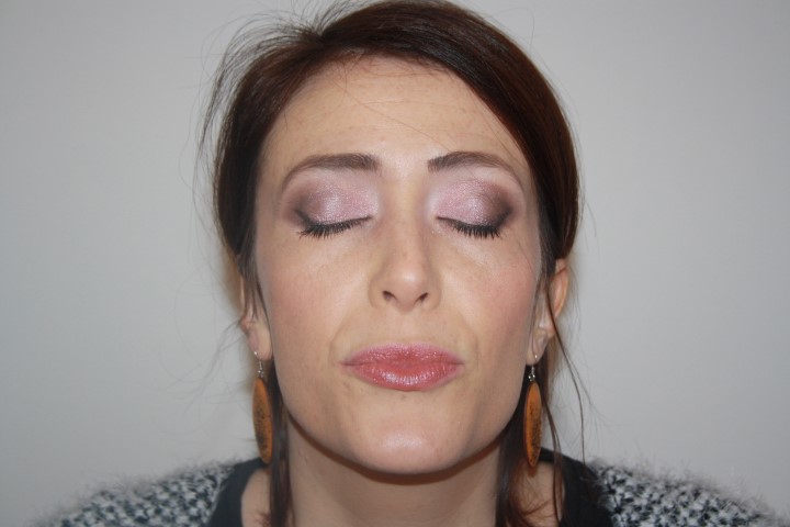 Su tutta la palpebra mobile ho applicato il color rosa carne scuro shimmer Dust, ho sfumato verso l’ esterno con il taupe scuro shimmer Mugshot, ho intensificato la piega con l’ ombretto nero opaco di Kiko n. 84 che ho utilizzato anche come eyeliner. Sotto l’ arcata sopraccigliare ho utilizzato il rosa carne Strange, il più chiaro della palette.