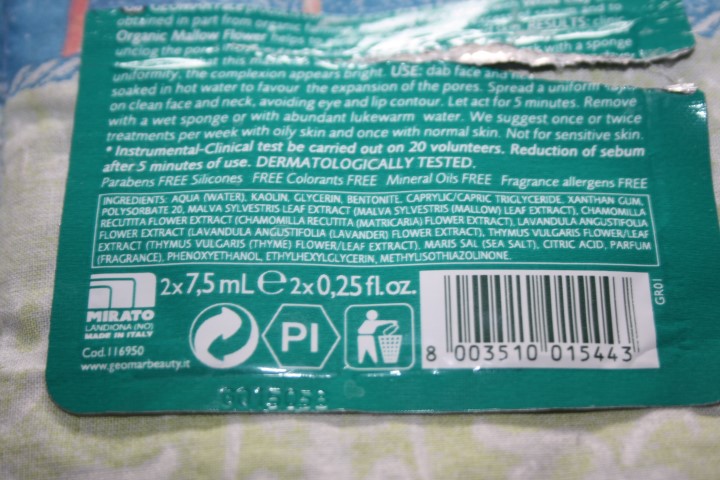 Questa maschera è adatta a chi ha la pelle mista o grassa ed è indicata una o due volte alla settimana, io l’ ho fatta una volta a settimana. All’ interno contiene argilla bianca che ha proprietà purificanti e seboequilibranti e fiore di malva astringente e calmante. Non sono presenti parabeni, siliconi, coloranti, oli minerali e vi sono almeno il 95% di ingredienti di origine naturale.