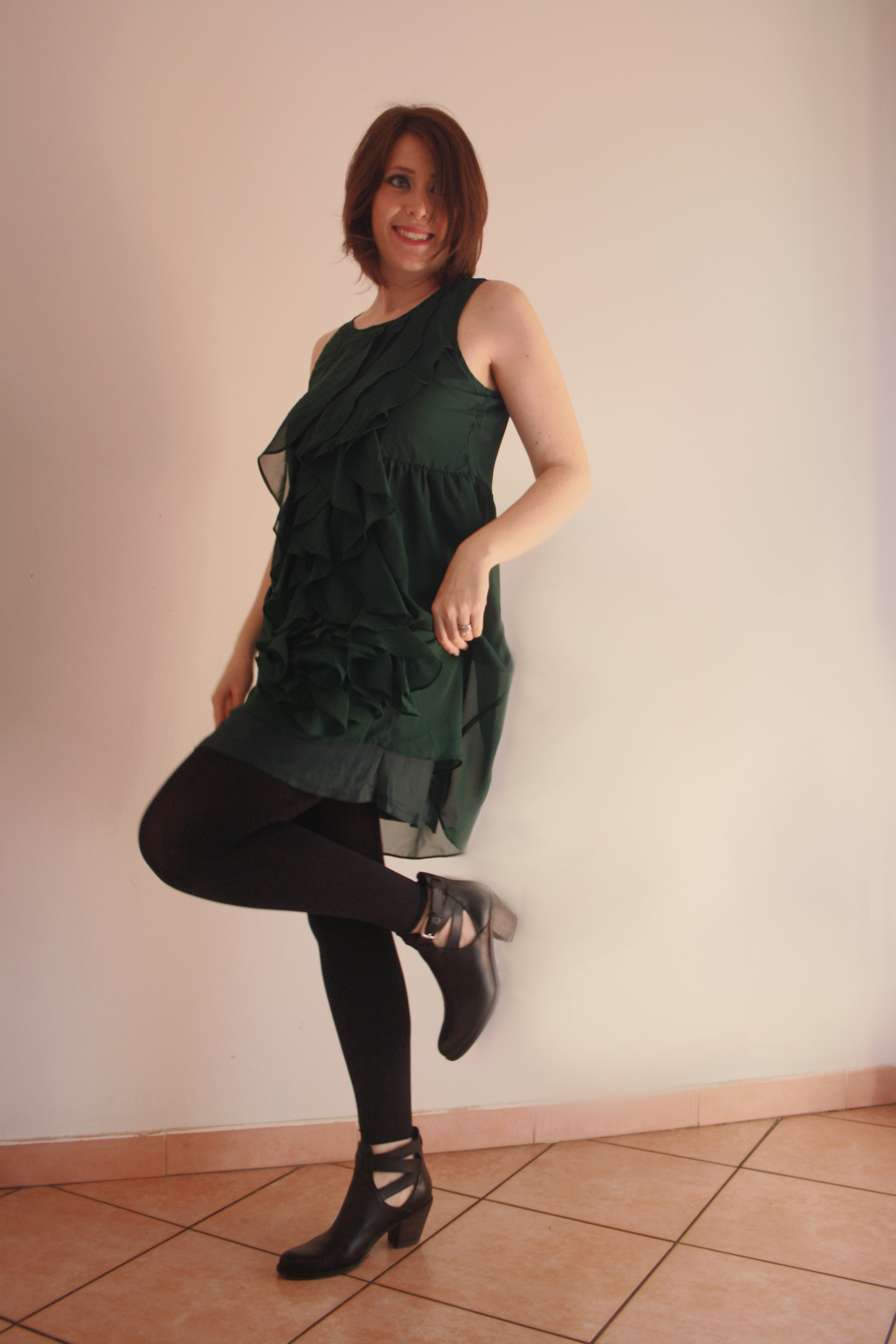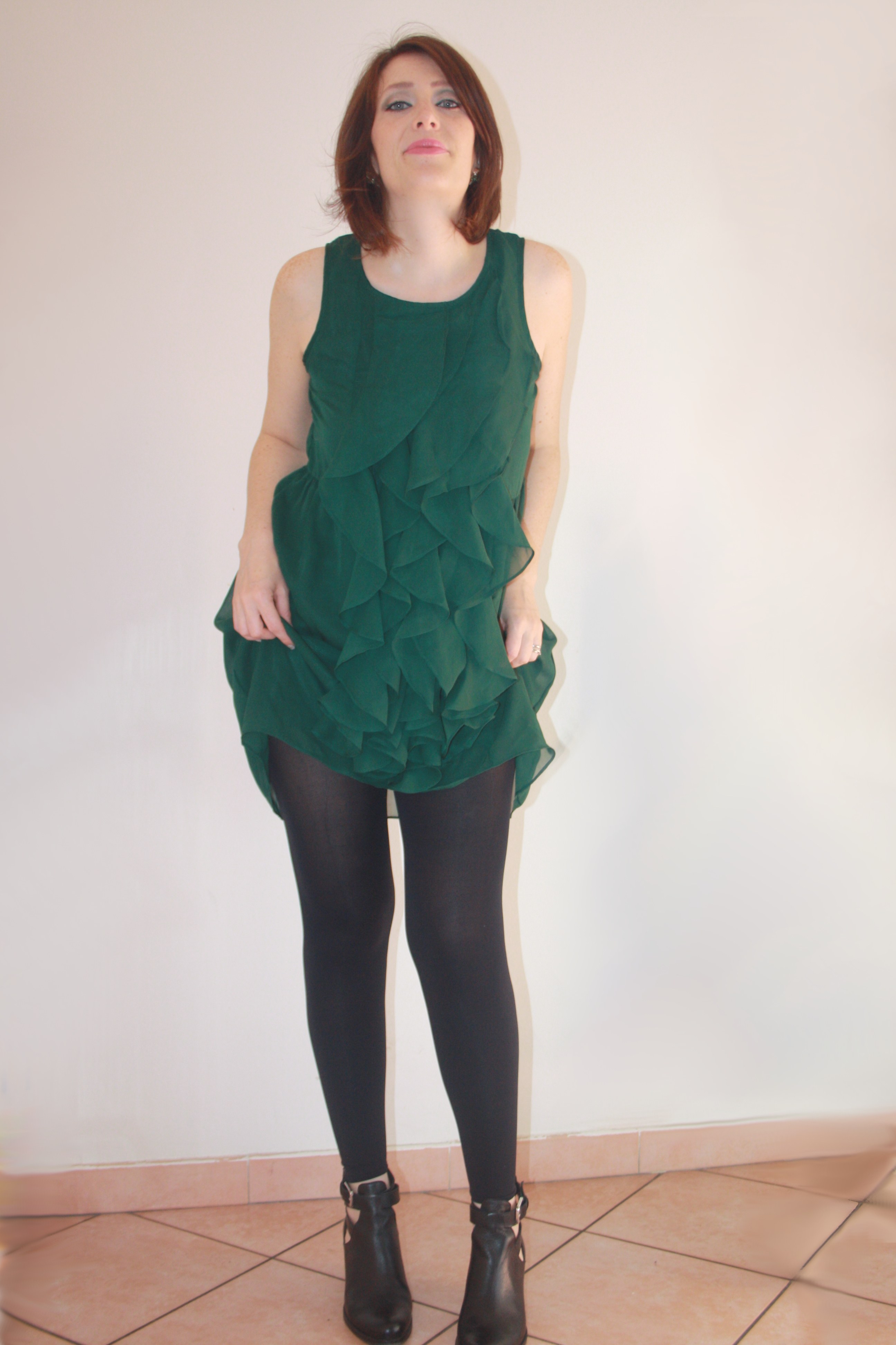 La mia amica Stefi mi ha prestato questo abito verde con taglio svasato e balze sul davanti che rimane molto morbido, non segna ed è comodo. Ho scelto di mettere dei leggins neri “massaggianti” che mi aiutassero a non fare gonfiare troppo le gambe durante la giornata; sono marca Lovable e hanno fatto davvero il loro dovere, compattano ma non sono fastidiosi.