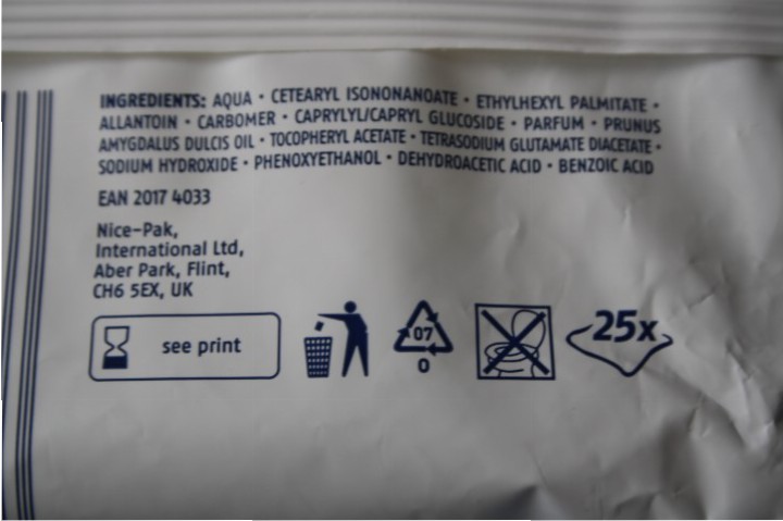 La confezione è la classica busta in plastica da 25 salviette con apertura a strappo, i dettagli del disegno sono in azzurro (attenzione esiste anche la versione in rosa).