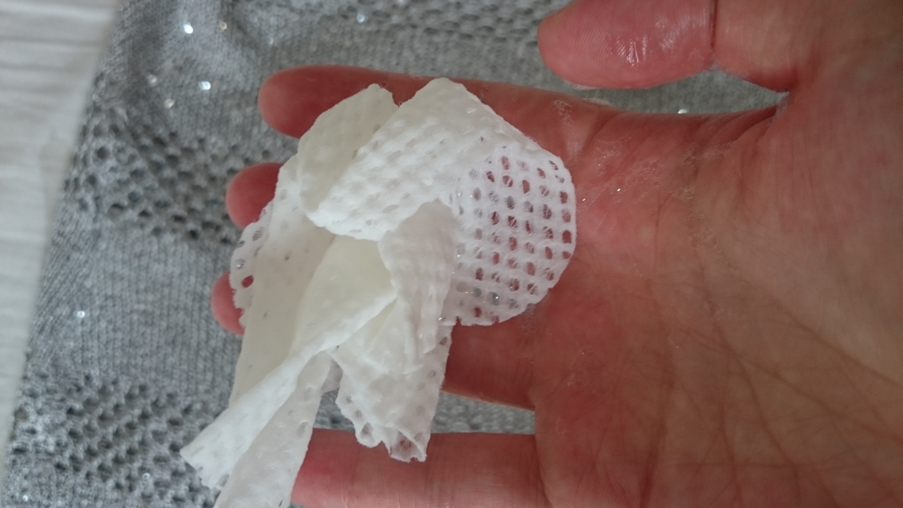 La confezione è una scatola di cartone grande all’ incirca come la mia mano e le salviette all’ interno sono asciutte! All’ utilizzo bisogna bagnarle sotto un getto d’ acqua per “attivarle”