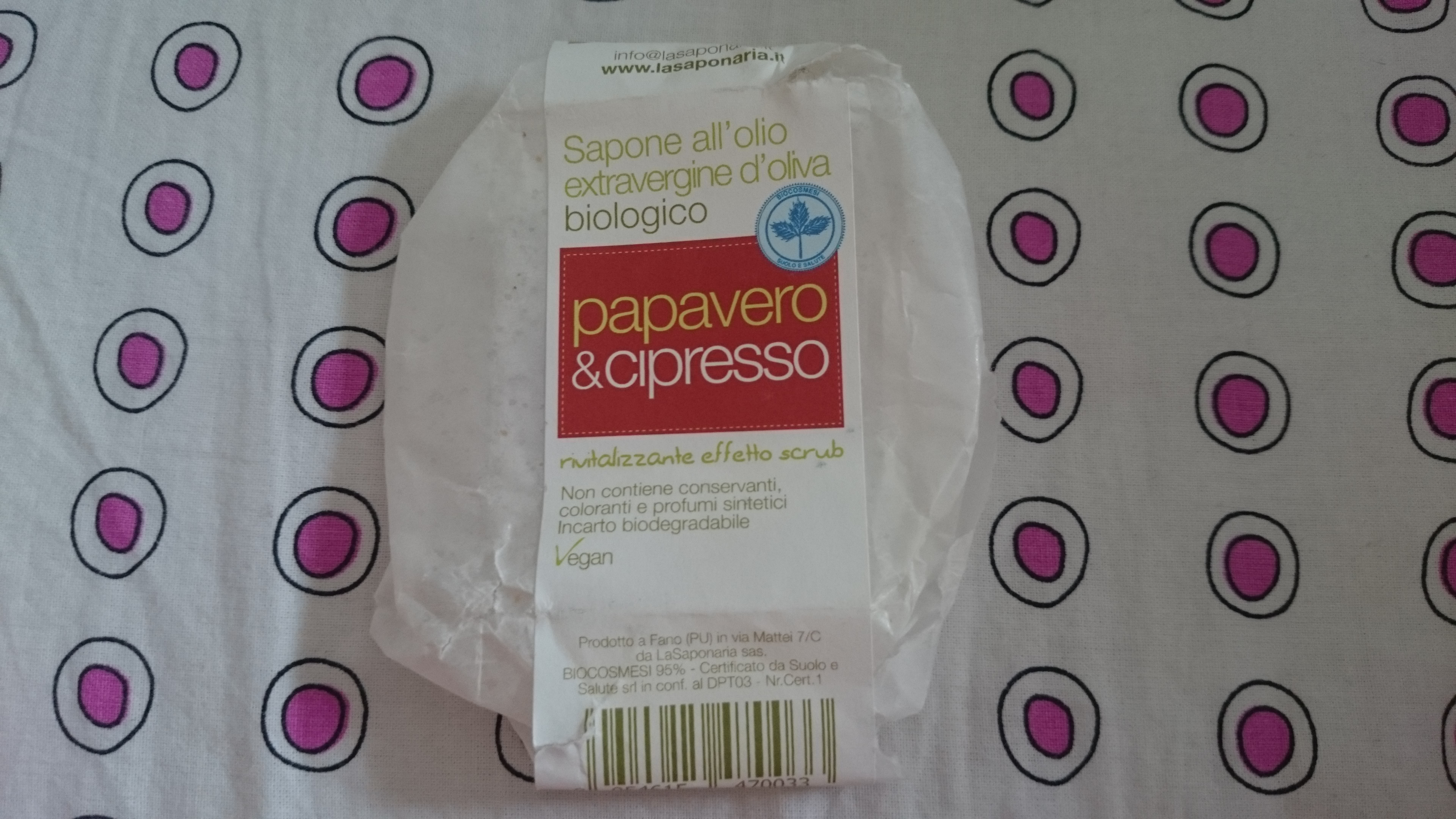 Oggi voglio parlare di una saponetta che ho avuto modo di provare grazie a Fefy che me l’ ha regalata, si tratta del sapone papavero e cipresso de La Saponaria.