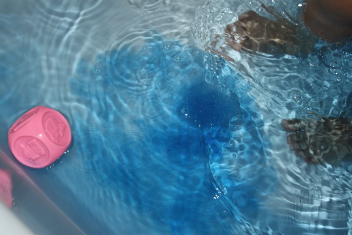 Ecco alcune foto per mostravi come funzionano: si buttano in acqua (la dose consigliata è una o due pastiglie) e queste iniziano a frizzare rilasciando colore, come potete vedere colorano abbastanza.