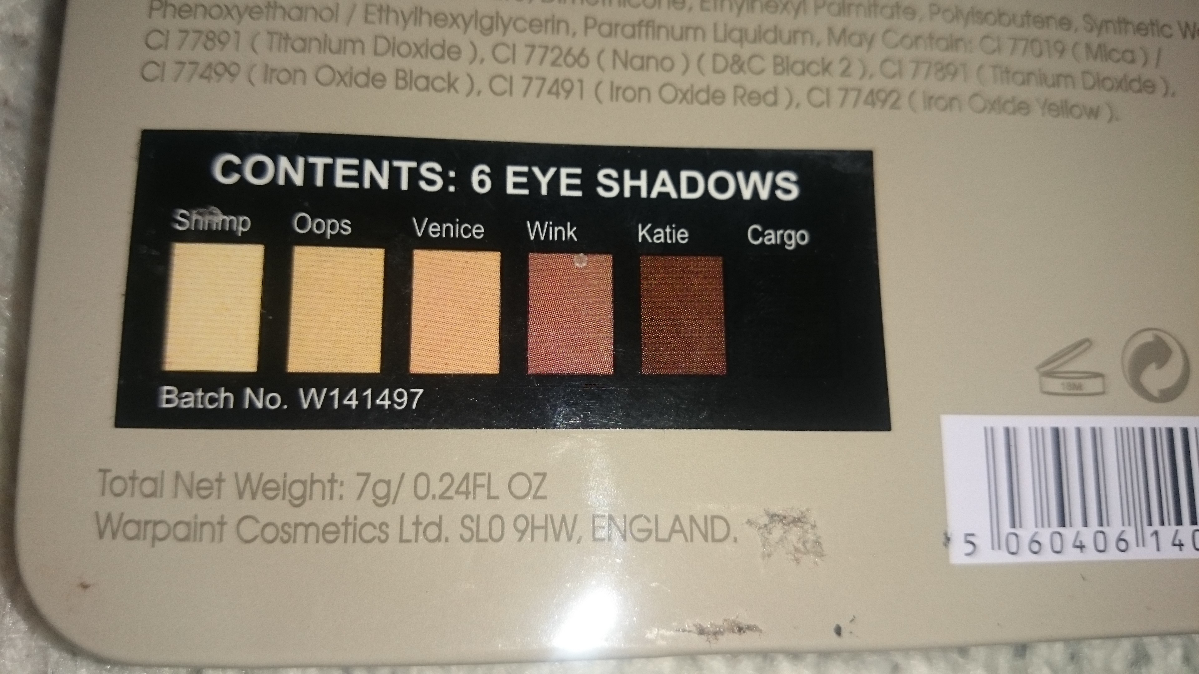 Gli ombretti sono sei e hanno forma rettangolare e non sono contrassegnati da nomi, che in realtà, potete trovare su un’ etichetta sul retro della palette stessa. Si parte da sinistra con in più chiaro un vaniglia shimmer Shrimp, per poi passare ad un crema mat Oops, un nude mat Venice, un nocciola Wink, un marrone Katie e un nero Cargo.