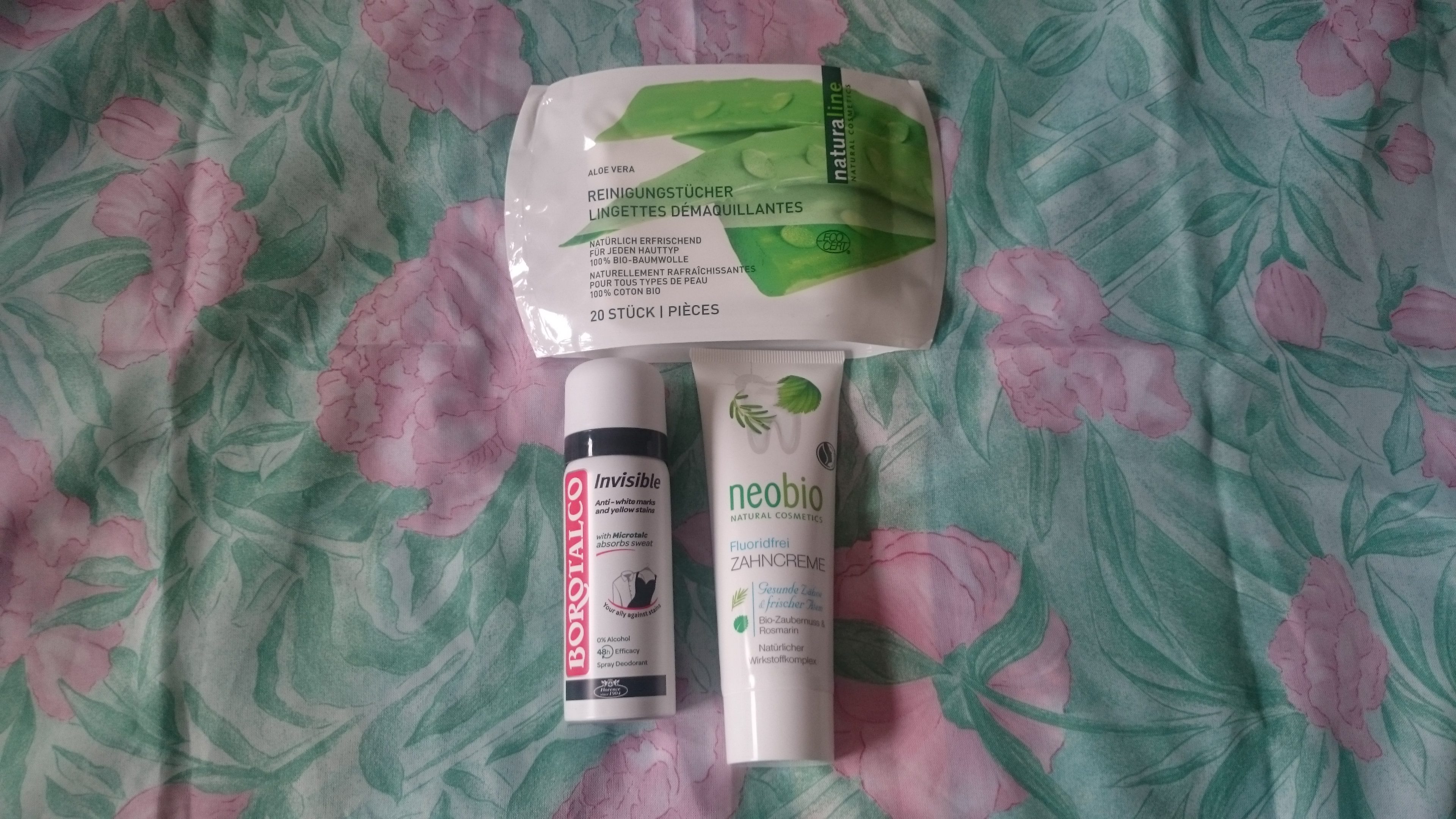 Questi prodotti sembrano un kit emergenza, si tratta delle salviette struccanti Naturaline, il deo invisible della Borotalco e il dentifricio Neobio menta e rosmarino.