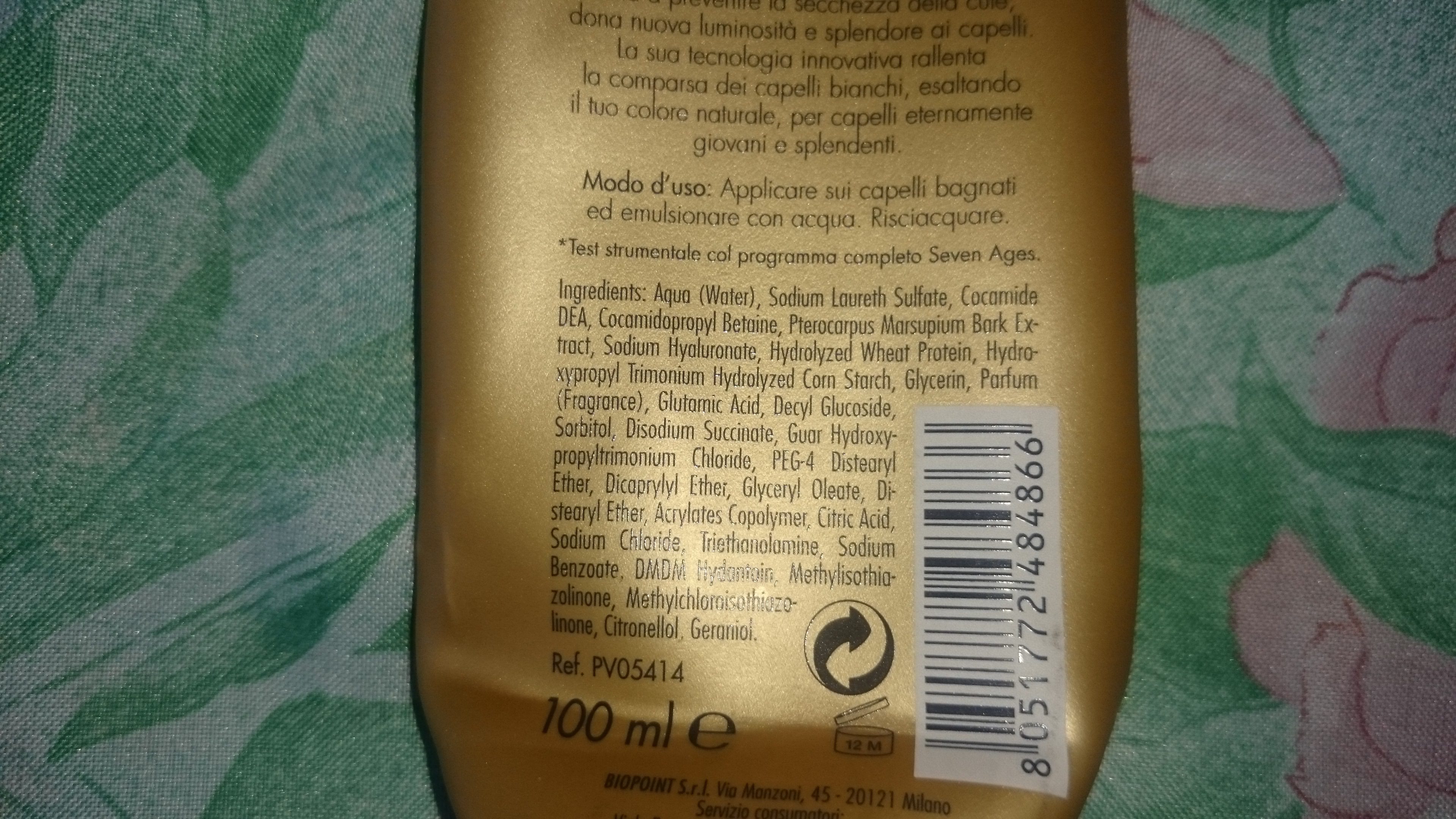 Questo shampoo dovrebbe combattere i sette segni del tempo ovvero la rottura, le doppie punte, l’ effetto crespo, l’ assottigliamento , l’ opacità, la secchezza e i capelli grigi.