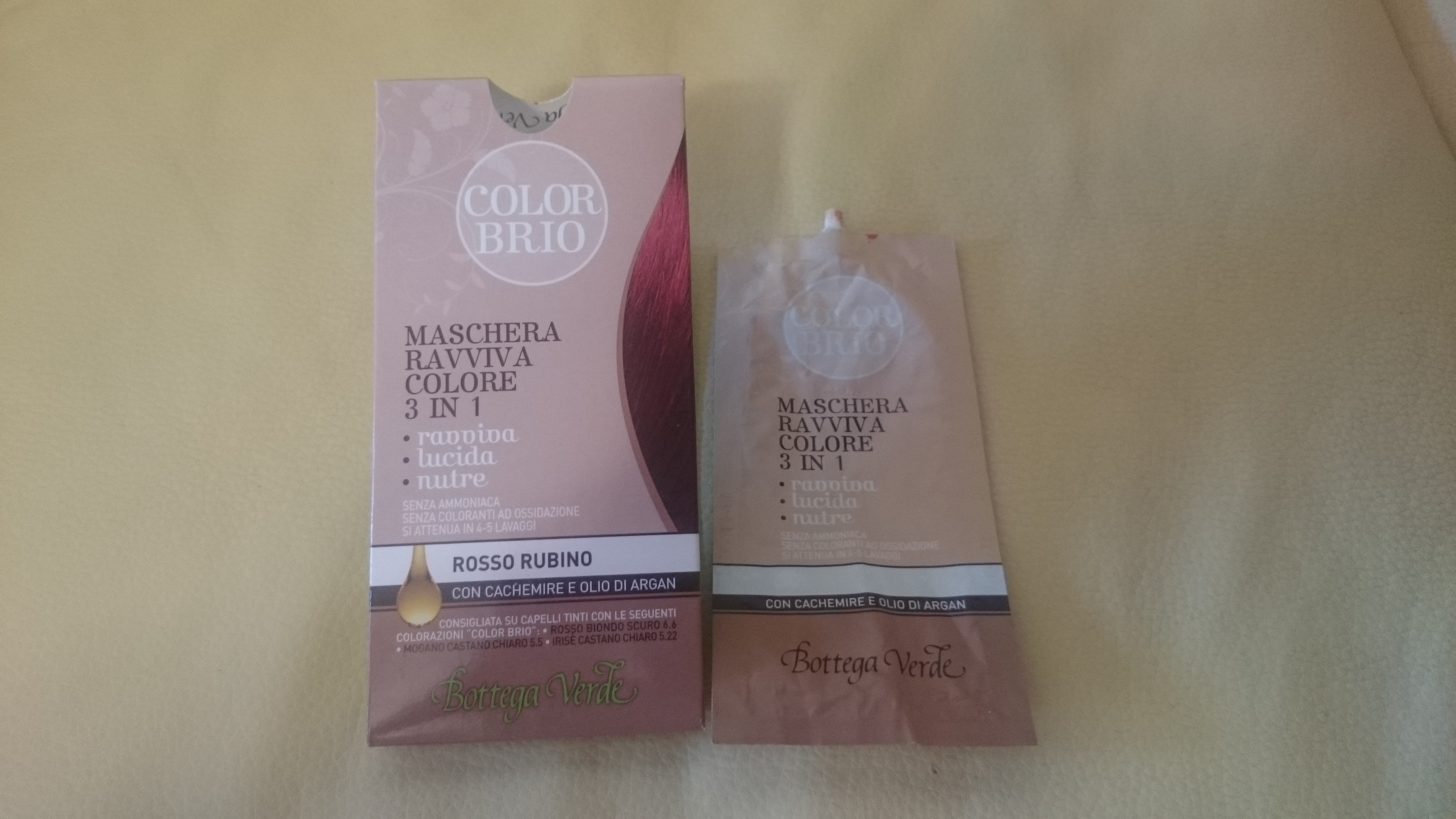 Il prodotto di cui vado a parlare è una maschera tre in uno che dovrebbe ravvivare il colore dei capelli, lucidarli e nutrirli. La confezione è una bustina da 25 ml contenuta in un rivestimento di cartone su cui sono scritte tutte le informazioni sul prodotto. All’interno si possono trovare anche un paio di guanti di plastica monouso.