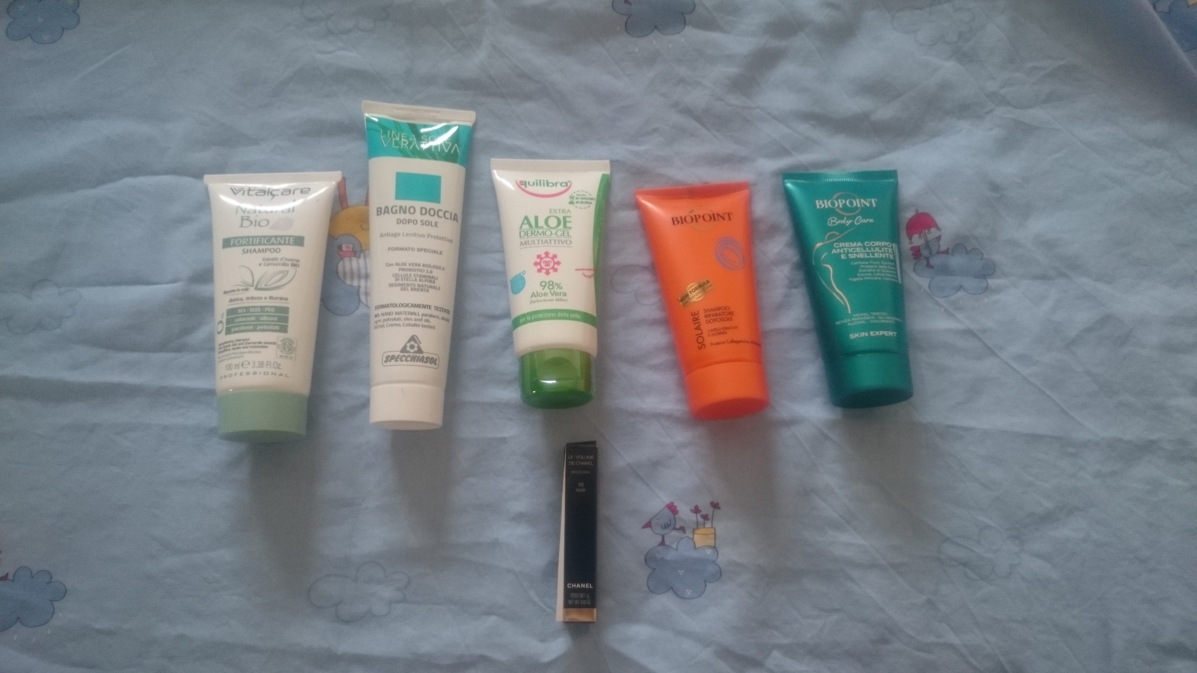 Abbiamo lo shampoo fortificante della Vital Care, il bagno doccia dopo sole della linea Verattiva di Specchiasol, il demogel all’ aloe di Equilibra, lo shampoo riparatore doposole della Biopoint, della stessa marca la crema corpo anti cellulite e il mascara Le Volume di Chanel.