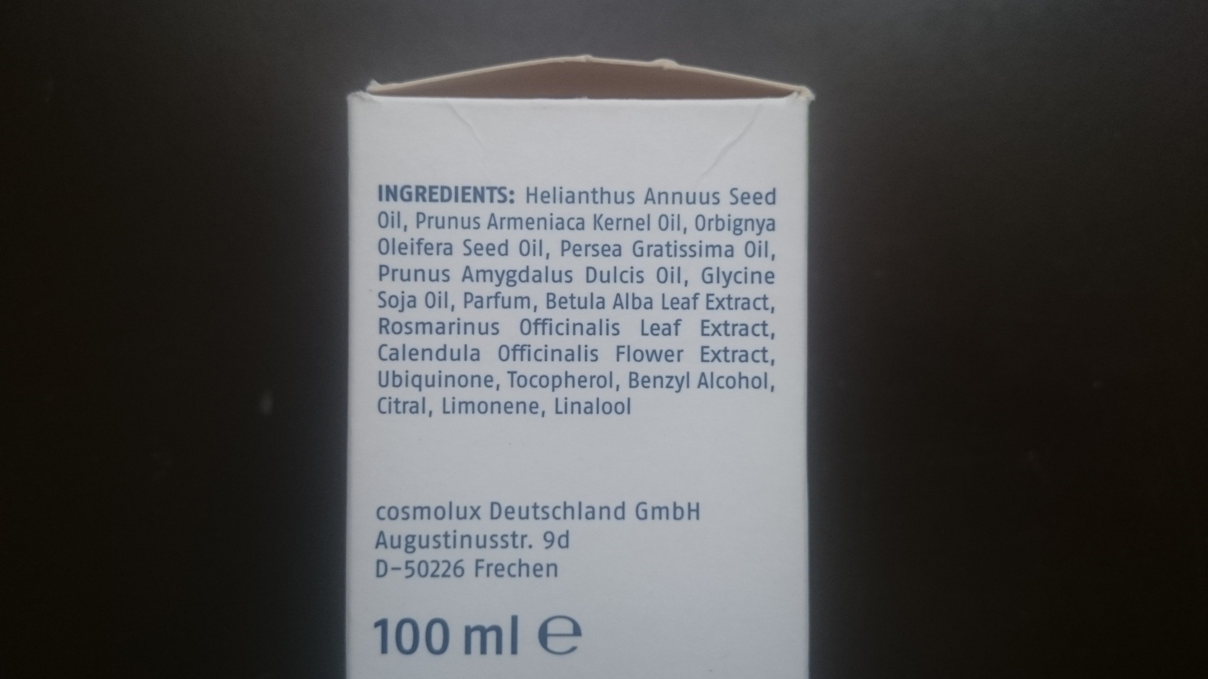Questo prodotto contiene un mix di oli quali l’ olio di semi di girasole, l’ olio di babassu, l’ olio di avocado, l’ olio di albicocco, olio di soia con estratto di betulla, rosmarino, calendula e Q10, ecco la lista completa degli ingredienti: