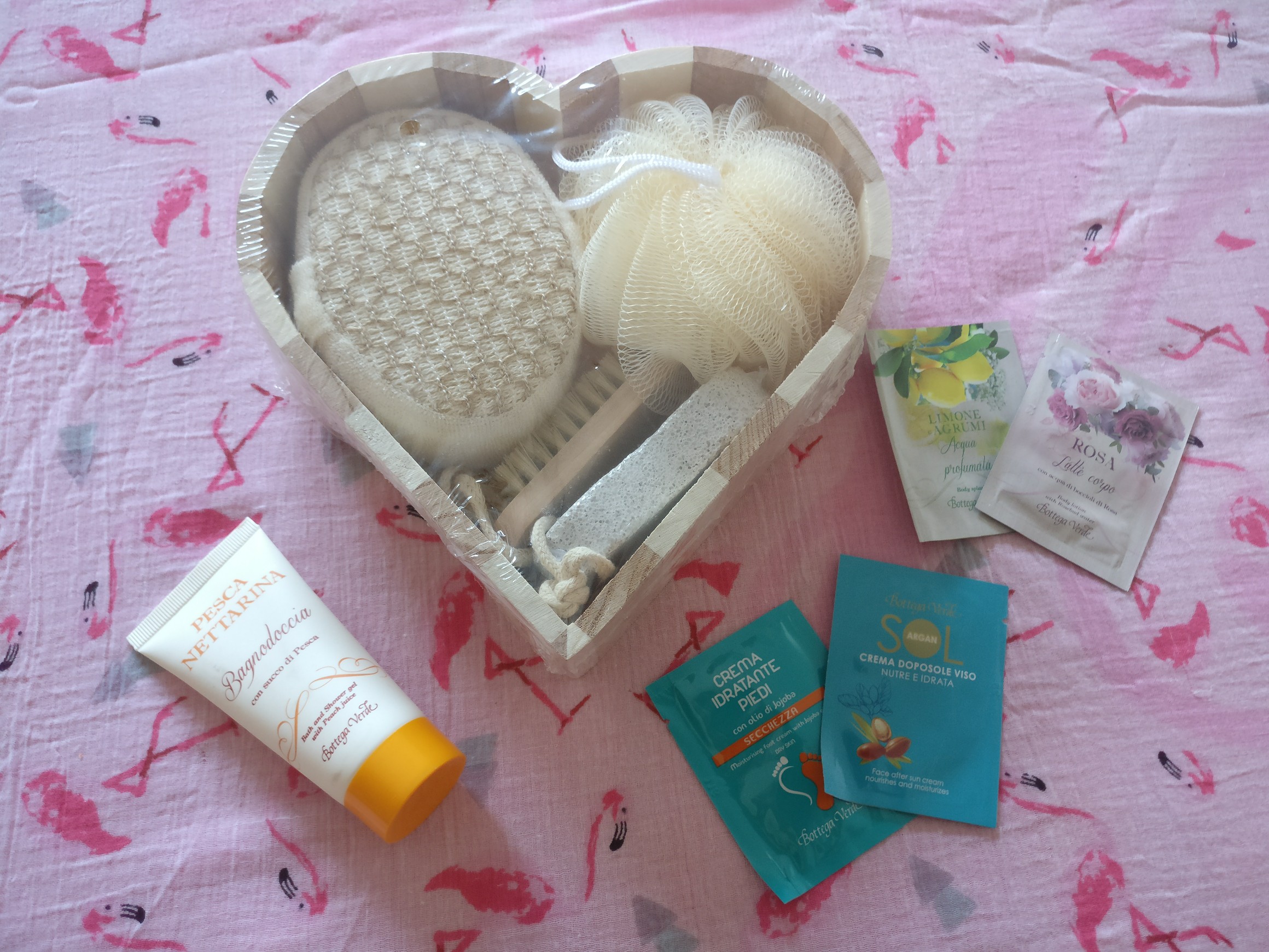 Ho trovato un set a forma di cuore con spugne, spazzole ecc.., un bagnodoccia pesca nettarina da 50 ml e quatto bustine di campioncini: un latte corpo alla rosa, una crema doposole argan, una crema idratante piedi e un’ acqua profumata limone e agrumi.
