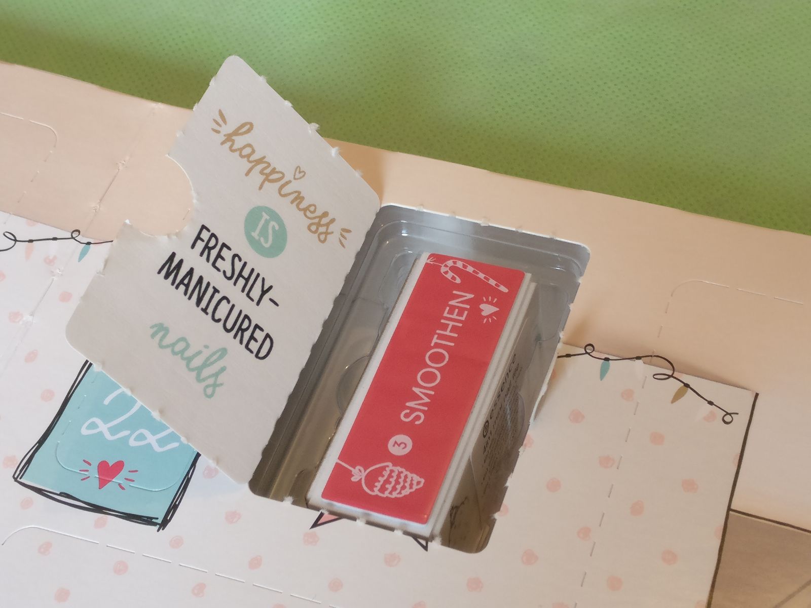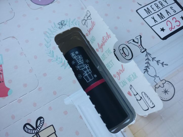 Nell’ ordine una limetta per unghie a quattro facce, uno smaltino color rosa chiaro e un rossetto, il colore è quello rappresentato dalla linea rosa scuro del packaging. La cosa carina è che tutti e tre sono decorati con simboli natalizi.