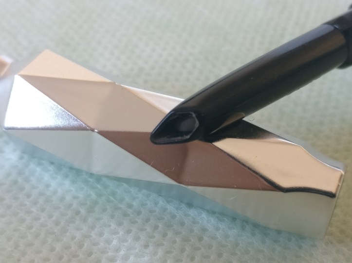 Ha una forma particolare, sembra un diamante, con una parte più ampia specifica per colmare le sopracciglia e un’ estremità affilata per definire i contorni.