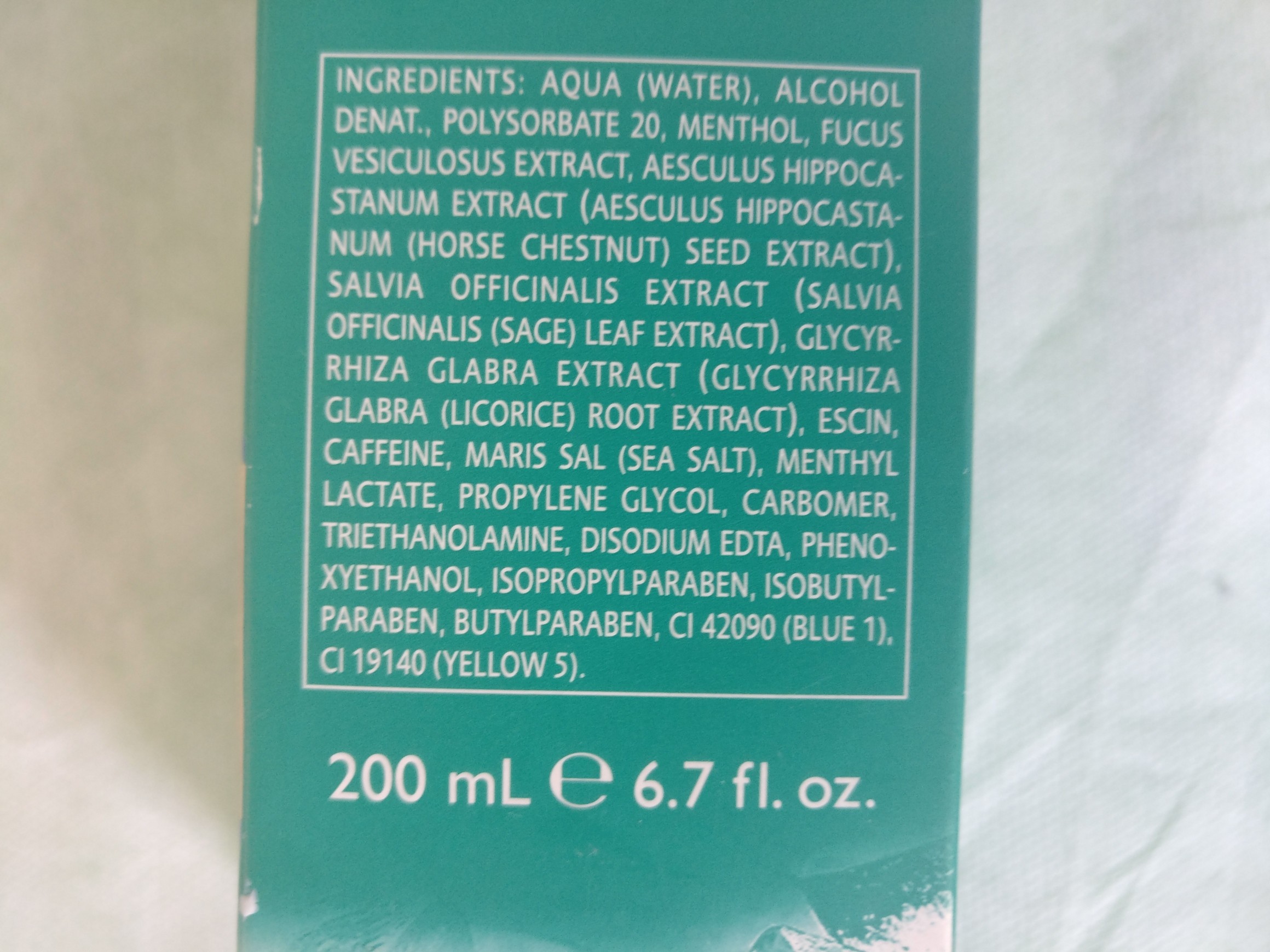 Questo gel contiene escina che aiuta a migliorare la microcircolazione e il drenaggio dei liquidi in eccesso, l’ estratto di ippocastano che rinforza le pareti dei capillari, la caffeina ed estratti di alghe che stimolano l’ azione lipolitica e oligoelementi del mar Morto che resistuiscono alla pelle elasticità.