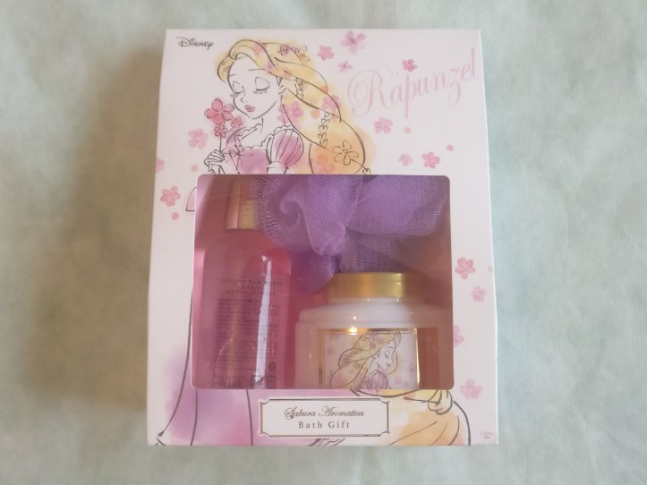 Una confezione contente una spugna di quelle a rete di colore viola, un bubble bath e una crema corpo nati dalla collaborazione tra Disney e il marchio Nol. Sui prodotti è raffigurata Ranpunzel.