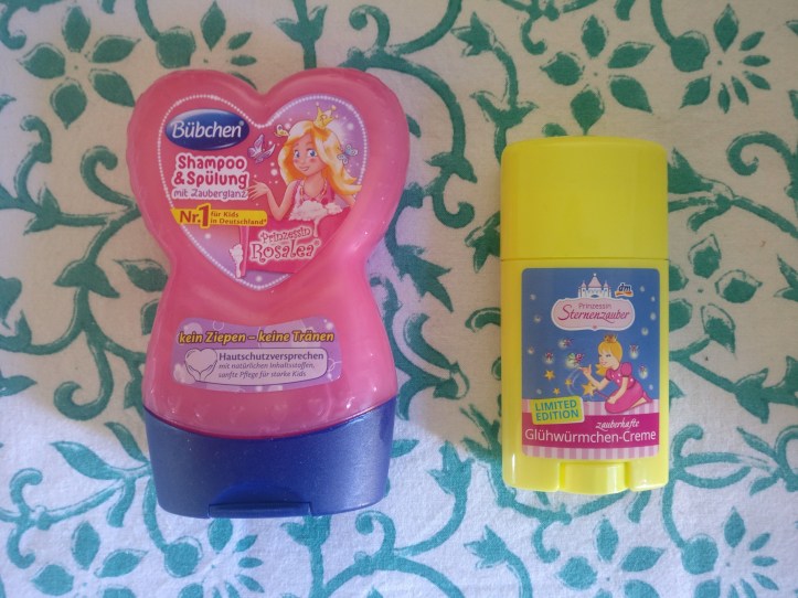 Per le bimbe ho portato un doccia shampoo Bubchen e l’ ho scelto per vari motivi, uno per la confezione che mi facilita il doverle lavare tutti i giorni e poi perché è un 2 in 1. La confezione gialla invece è una crema idratante del DM della linea Prinzessin Sternenzauber che usiamo come dopo sole.