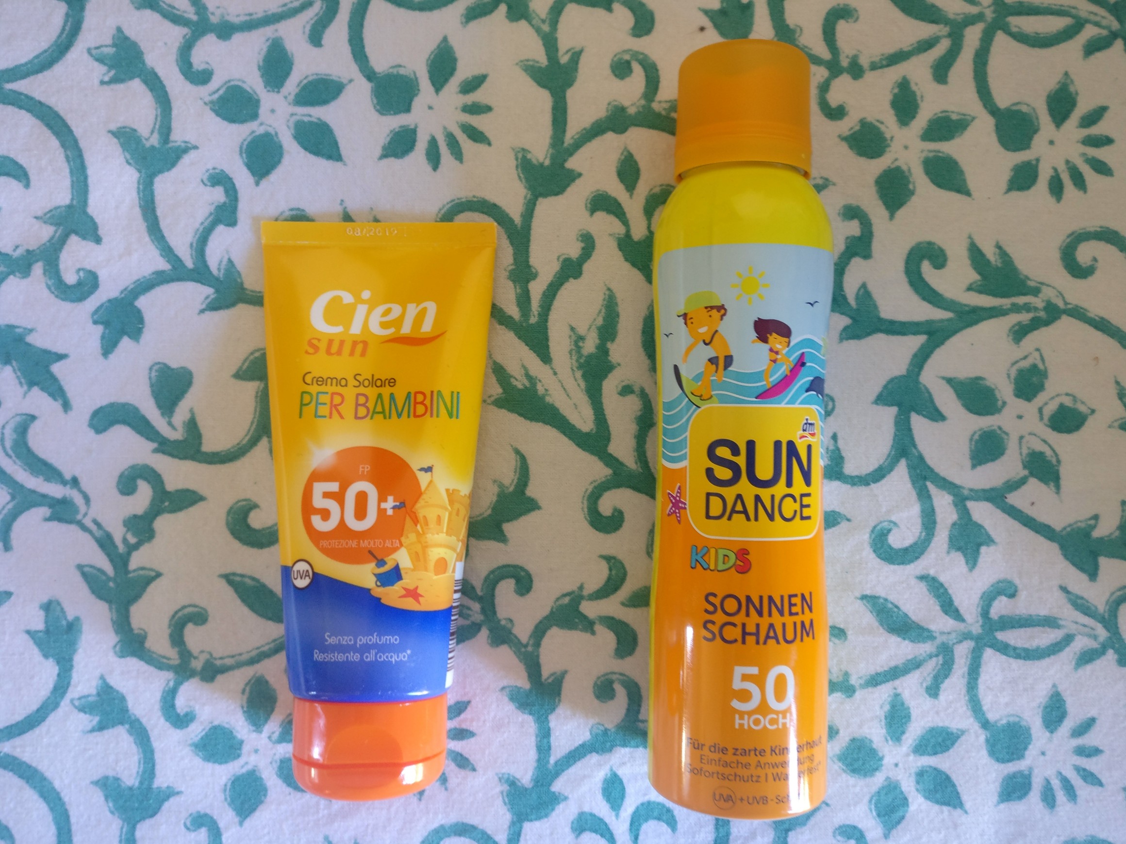 Per quanto riguarda le bambine ho portato una Cien 50+ che avevo già iniziata e una mousse presa al DM  in Slovenia protezione 50.