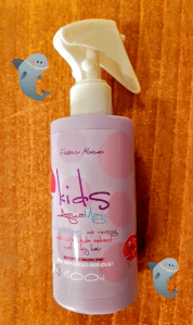 La confezione è di color viola in plastica con un adesivo con i pesciolini. L’ erogatore è uno spruzzino che ha verso la base un pulsantino per bloccare la fuoriuscita del liquido, molto utile nei prodotti per bambini specialmente se finiscono in borsa.