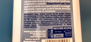 La confezione è quella classica degli shampoo Coop, in plastica con tappo a scatto. L’ azzurro ghiaccio trae in inganno facendoti pensare a qualcosa di fresco e delicato.