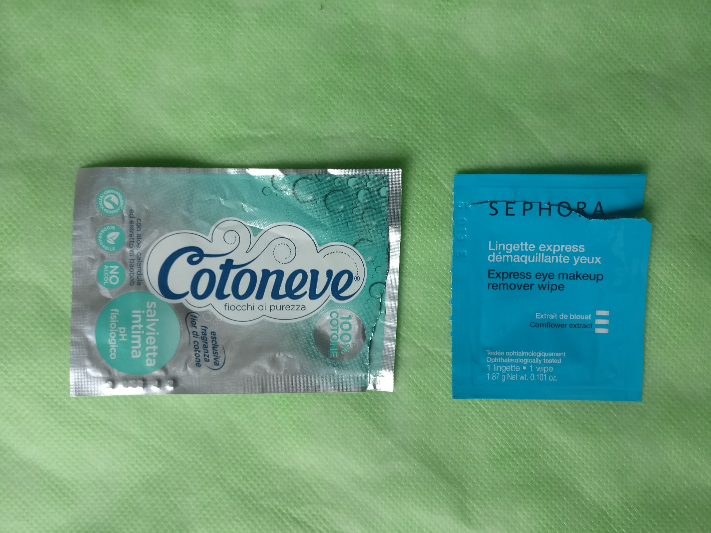 Non ricordo dove avevo recuperato questo campioncino. Si tratta di una salvietta intima, in cotone al 100%, che non contiene alcool ma aloe, calendola ed estratto di baobab ed è biodegradabile. Era umidificata al punto giusto e non mi ha creato fastidi o bruciori.