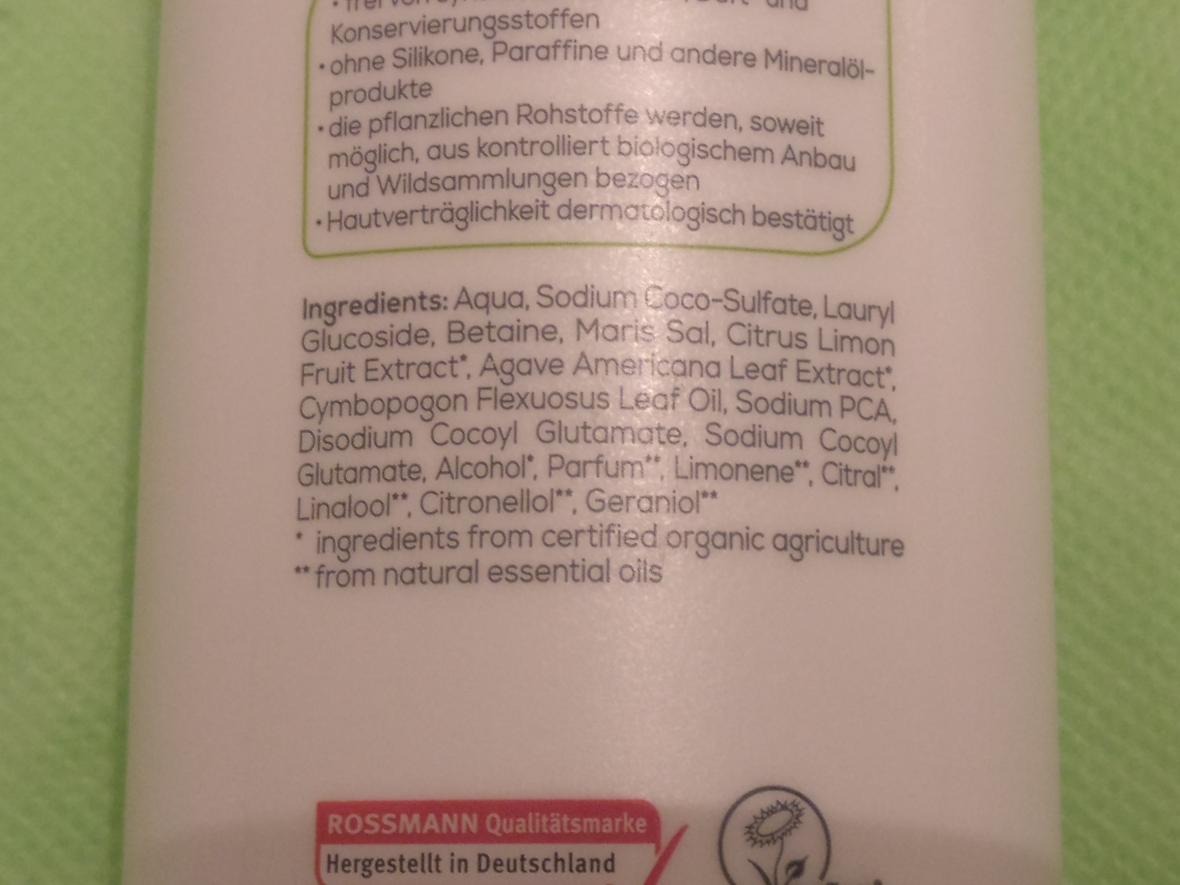 Contiene lime bio e agave bio. Non contiene siliciconi, paraffina e oli minerali e questa è la lista degli ingredienti: