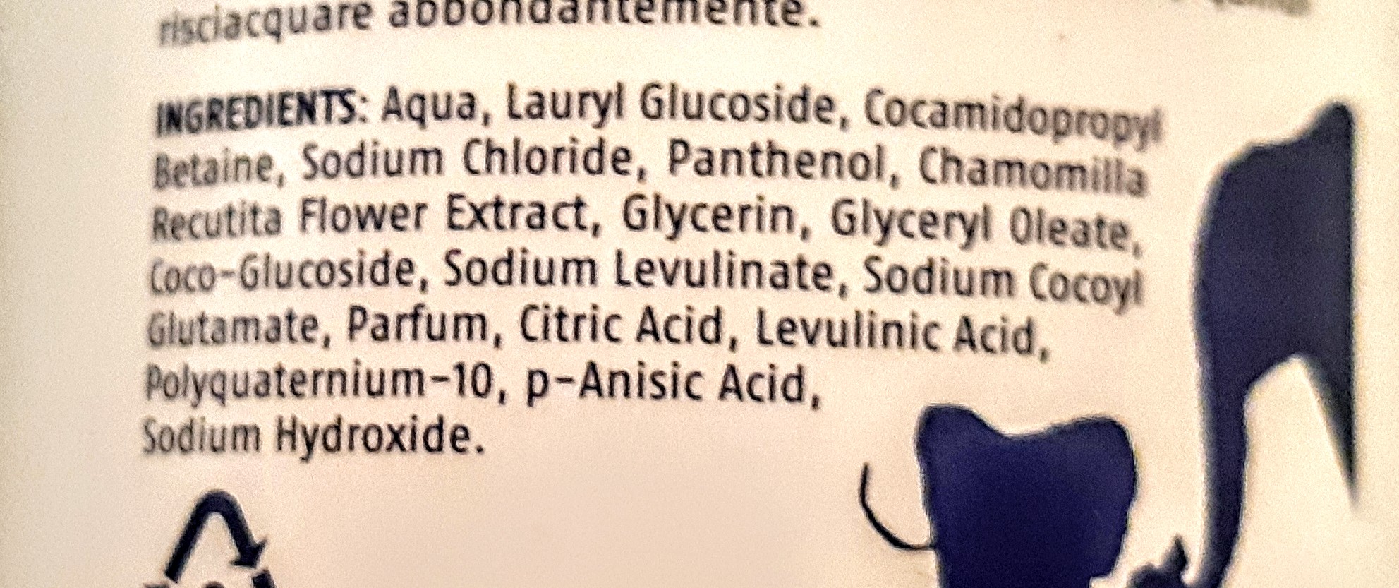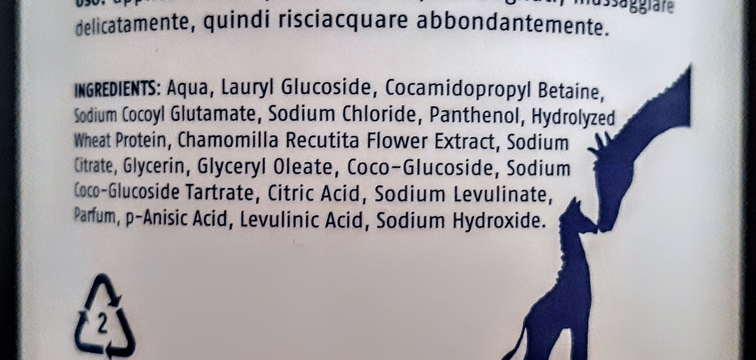 Contiene estratto di camomilla che ha un’ azione calmante, proteine del frumento e sostanze detergenti prive di saponi.