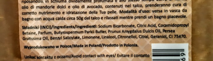 Si presenta come una specie di sale da bagno color latte in polvere che una volta a contatto con l’ acqua si scioglie creando una schiuma profumata.