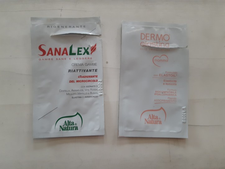 . ALTA NATURA – SANALEX GAMBE LEGGERE. Questo campioncino arriva dal Sana. Utilizzandolo una volta sola non sono stata in grado di valutarne gli effetti. Posso solo dire che si assorbe facilmente e che ha una profumazione da prodotto di farmacia.