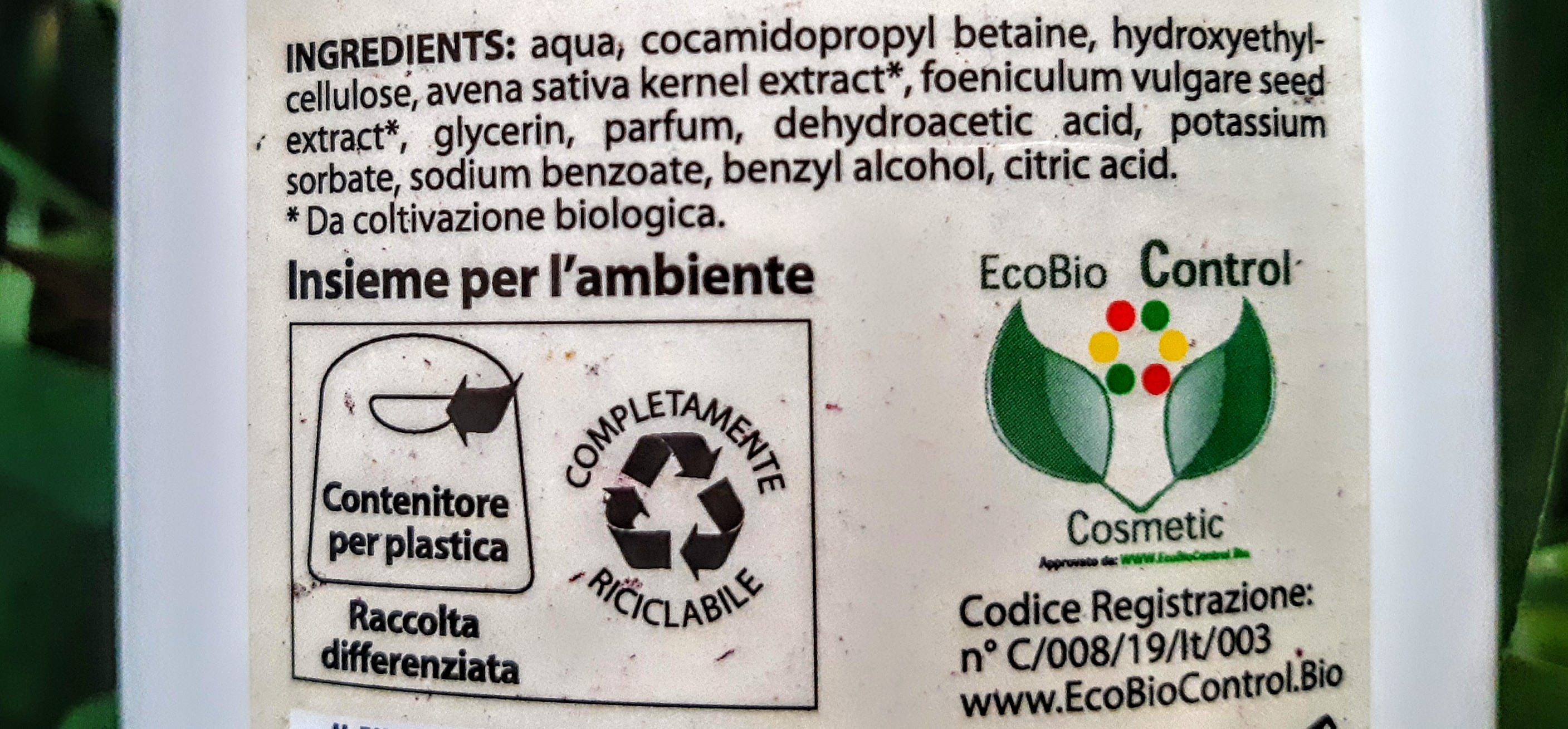 Contiene estratto di avena e glicerina, tutte le sostanze lavati sono di origine vegetale e questa è la lista degli ingredienti:
