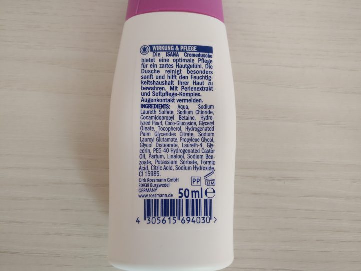 Questo doccia crema è di colore bianco è abbastanza consistente (non troppo liquido), a contatto con l’acqua fa una bella schiuma. Deterge senza seccare.