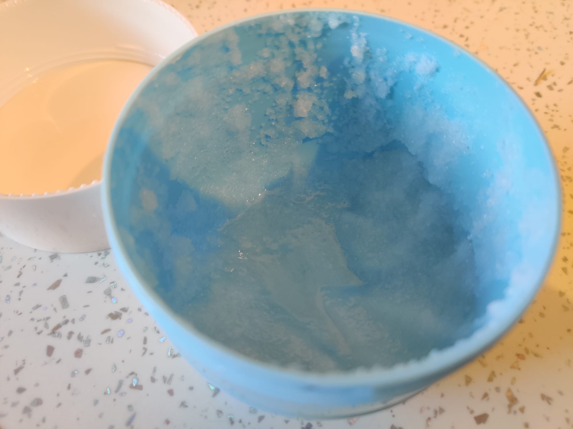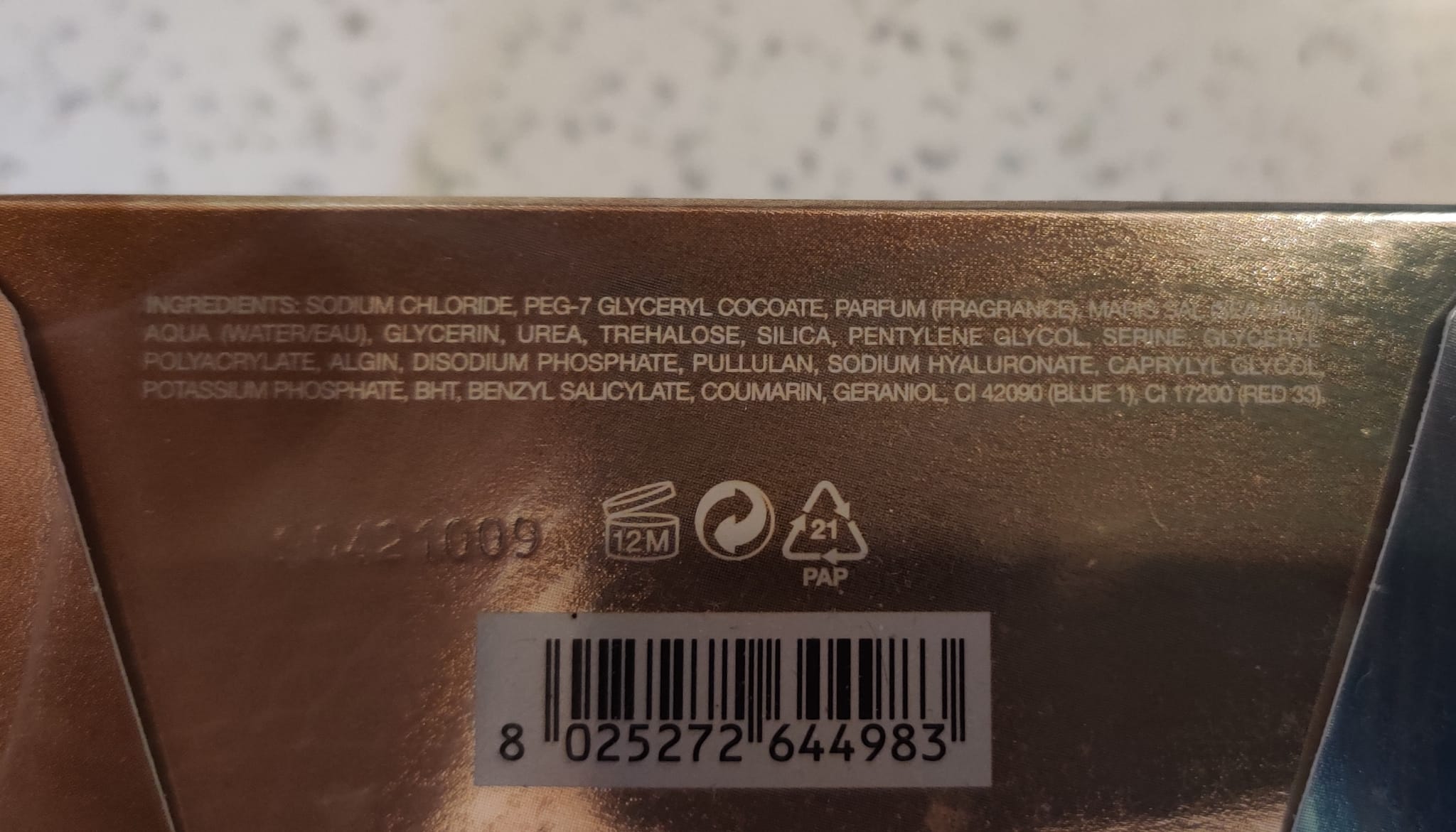La confezione invece bianca e azzurra con tappo a vite e corredata di spatolina in plastica per mischiare il prodotto e prelevarlo. L’esfoliante ha l’aspetto di sale bianco imbevuto di olio.