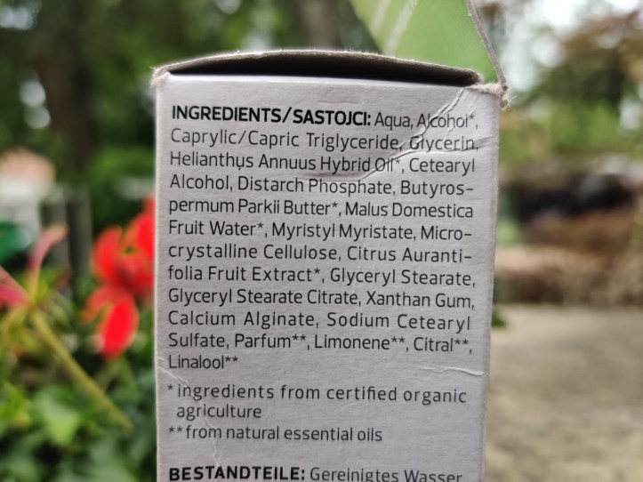 Contiene estratti di lime, acqua di mela e burro di karité. Fate attenzione perché al secondo posto nella lista degli ingredienti c’è l’ alcool.