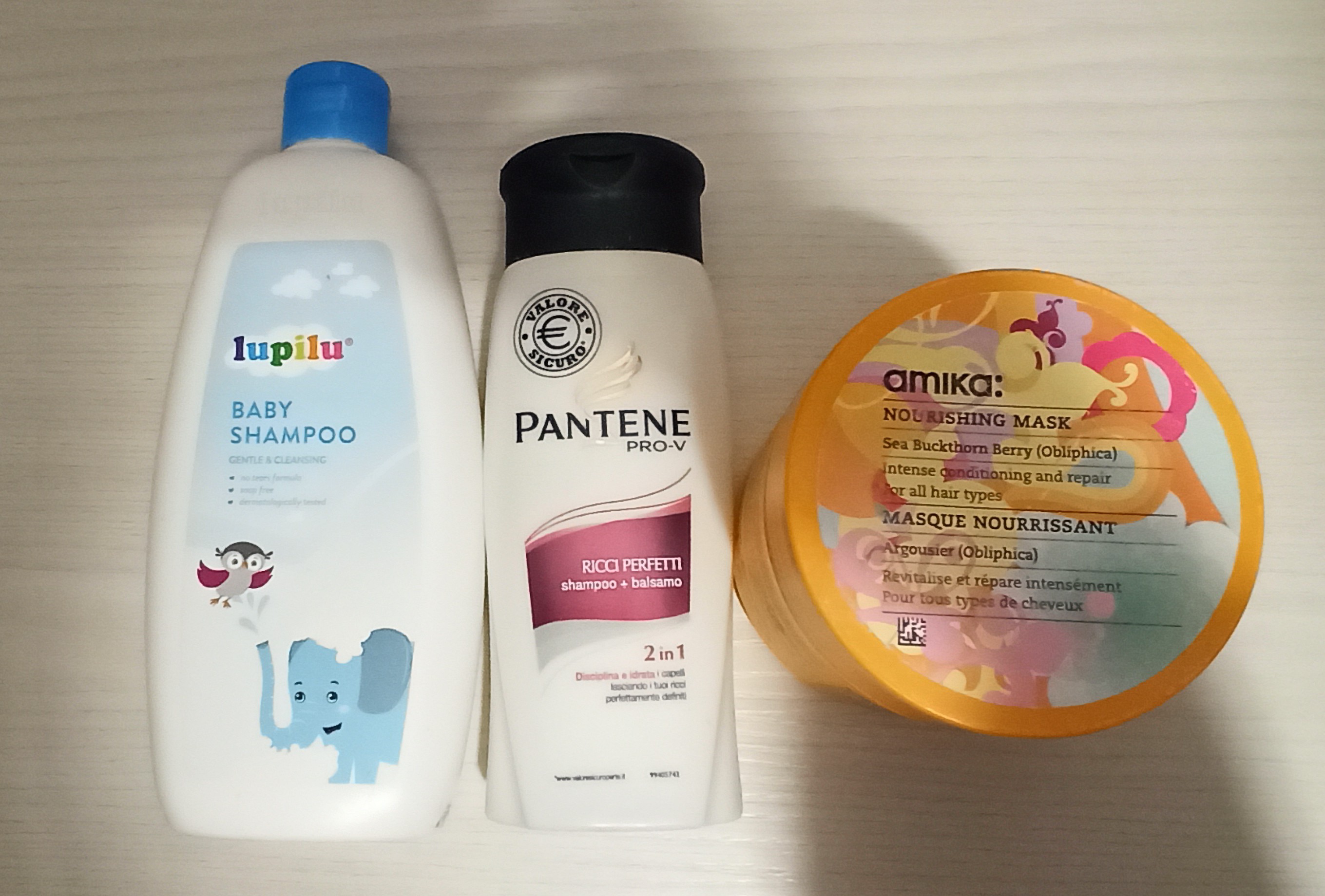 PANTENE – RICCI PERFETTI SHAMPOO + BALSAMO. Io non posso utilizzare shampoo Pantene perché troppo aggressivi sul mio cuoio capelluto. Se non sbaglio l’aveva acquistato mia suocera per mio marito che ci si è trovato bene.
