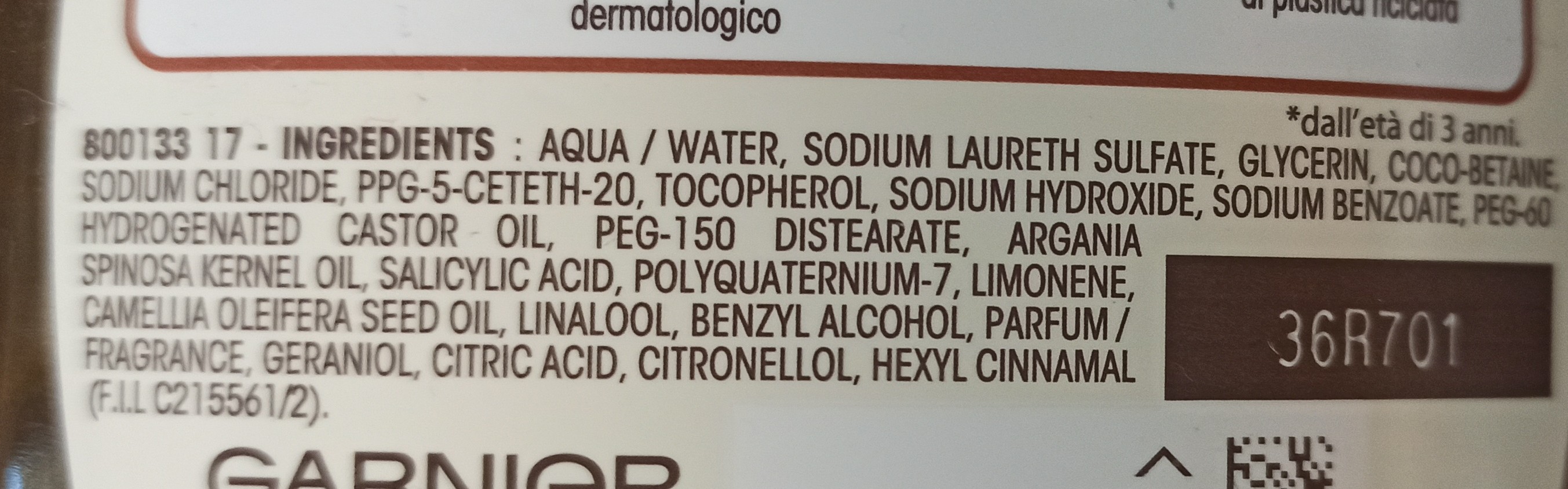 La formula contiene olio di argan, nutriente ed emolliente, e olio di camelia addolcente. Gli attivi detergenti sono di origine vegetale e questa è la lista degli ingredienti: