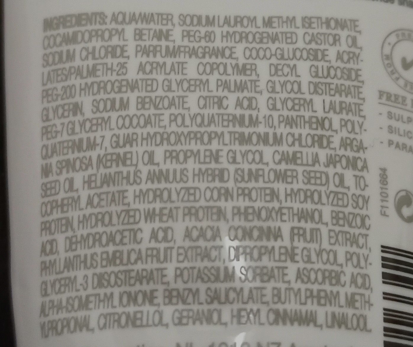 La formula è arricchita con olio d’argan e shikakai, è senza solfati, siliconi e parabeni e questa è la lista degli ingredienti: