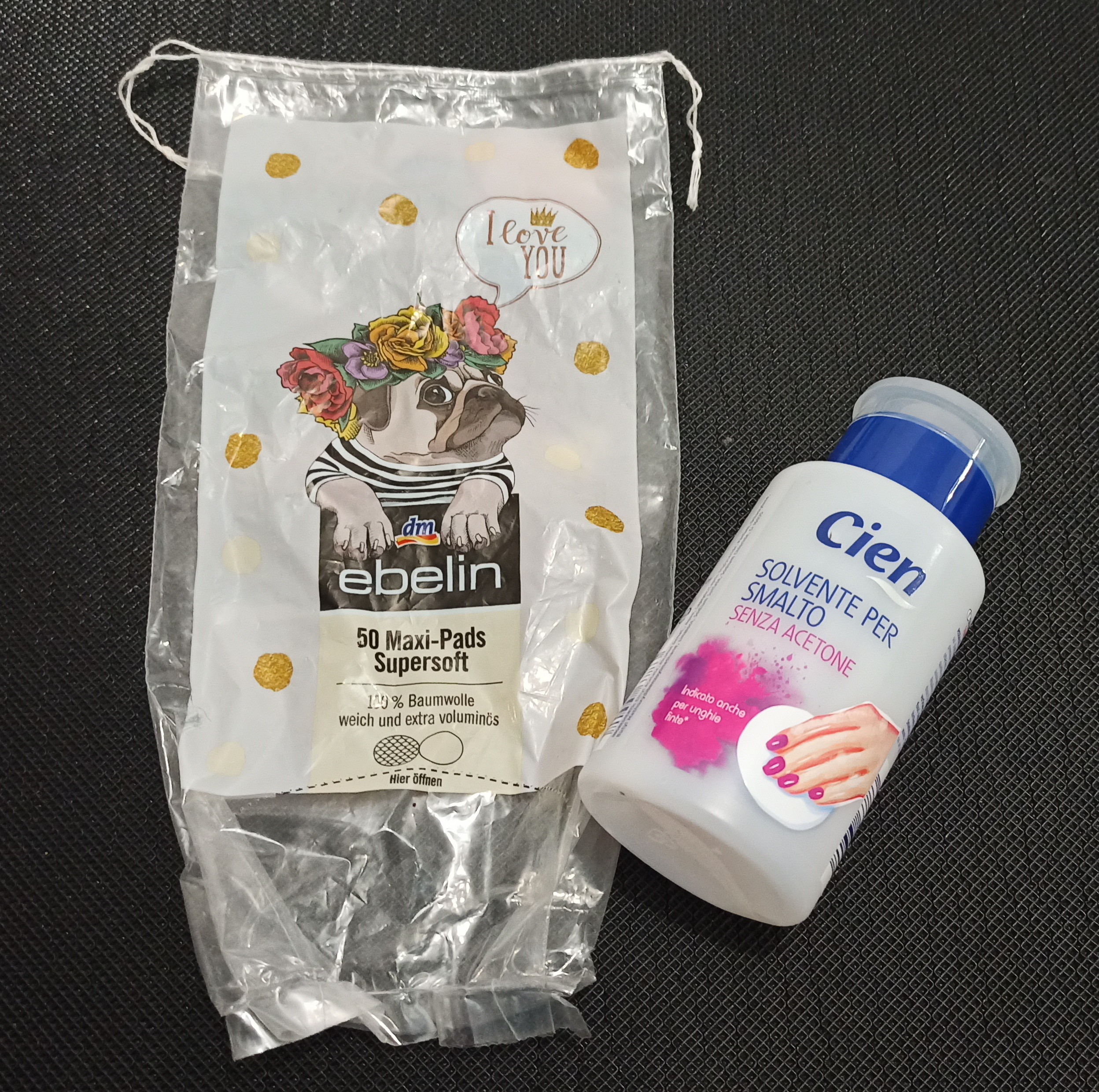 EBELIN DM – DISCHETTI DI COTONE. La confezione di questi dischetti vale tutti l’euro e 19 che costano. Sono dischetti grandi, da una parte lisci, dall’altra zigrinati. Mi ci sono trovata bene e potrei comprarli; chissà che disegno ci sarà sulla prossima confezione.