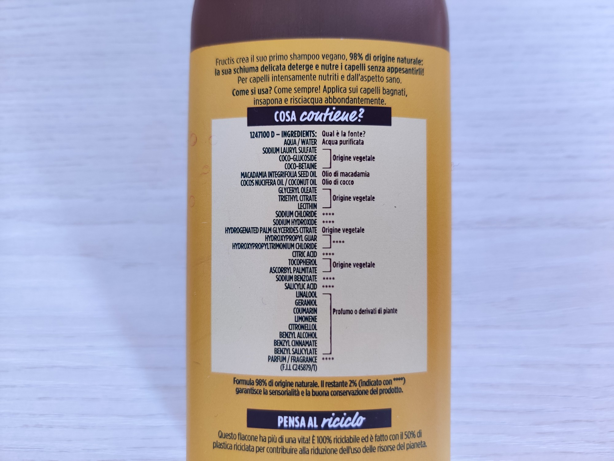 La formula 98% di origine naturale contiene olio di macadamia e olio di cocco e questa è la lista degli ingredienti: