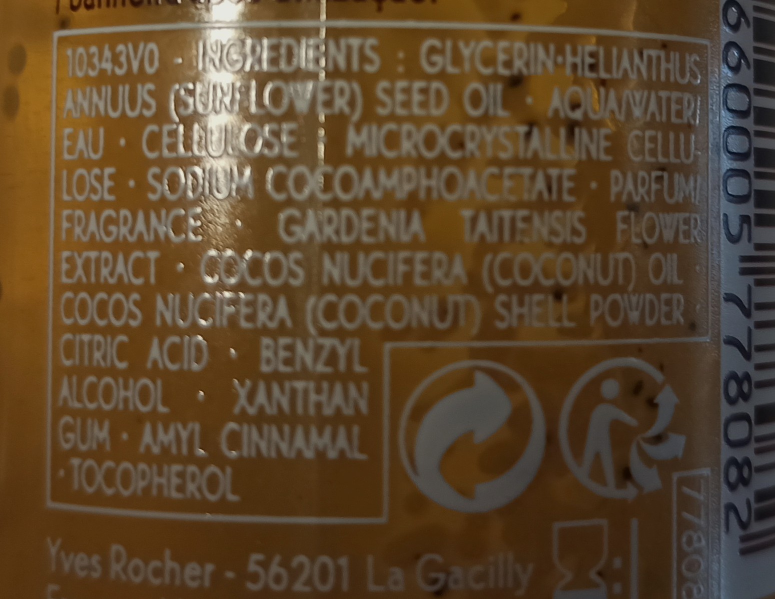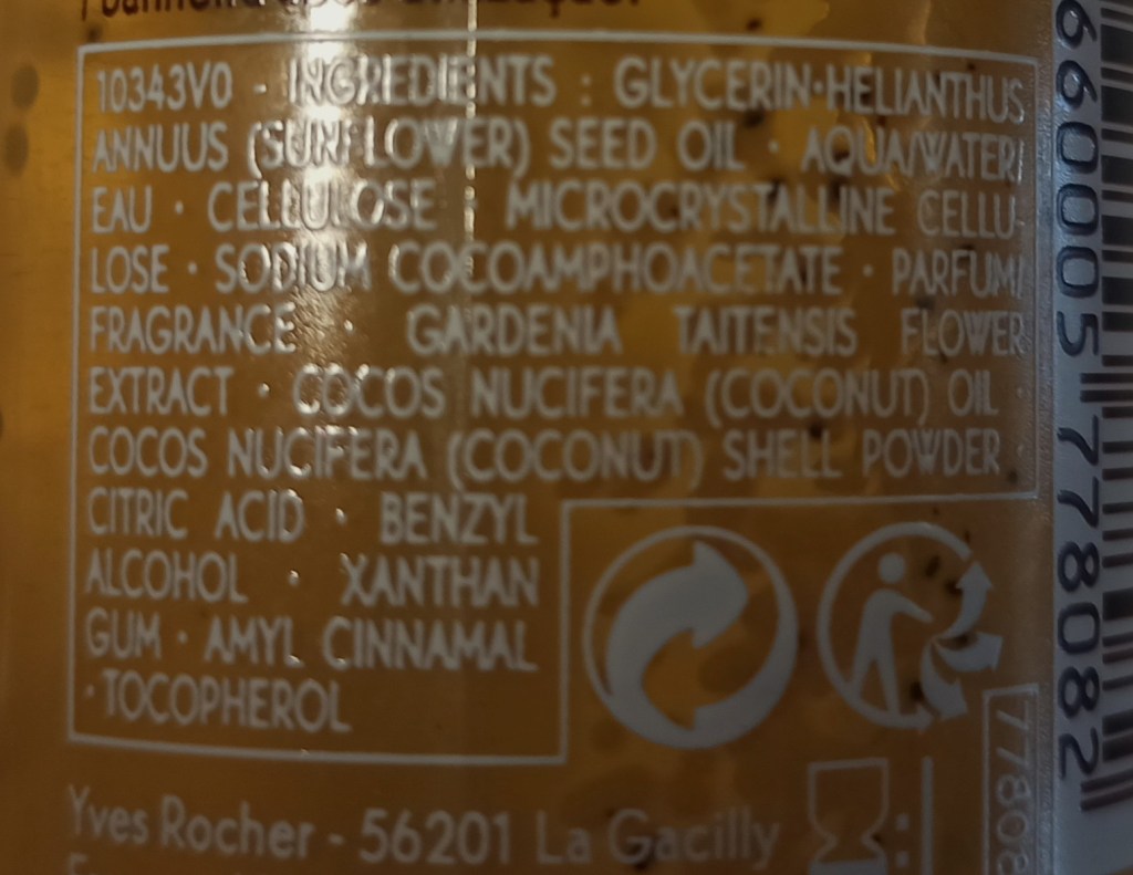 Questo scrub contiene il 97% di ingredienti di origine naturale, l’ olio di girasole antiage, polvere di guscio di noce di cocco e monoi de Tahiti. Non ci sono parabeni, siliconi e questa è la lista degli ingredienti: