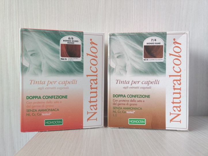 HOMOCRIN – TINTA PER CAPELLI NATURAL COLOR 6/6 BIONDO SCURO ROSSO E 7/4 BIONDO RAME. Ogni confezione di tinta contiene due kit completi al costo di €15 circa e si può trovare in farmacia. È semplice da utilizzare. Fate attenzione che può essere piuttosto liquido. Tinge bene i capelli bianchi.