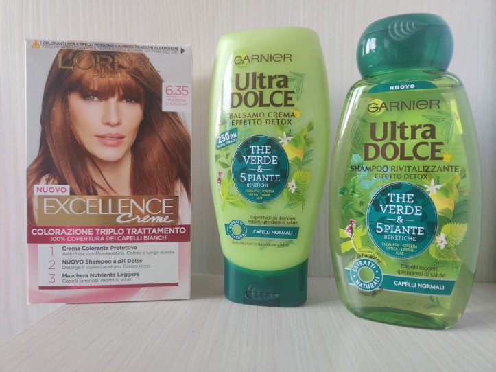 Per quanto riguarda i capelli ho preso la tinta Eccellente Creme 6.35 marron chocolat a 6.90€ e lo shampoo e balsamo Ultra dolce Garnier the verde e 5 piante a 2,39€ l’ uno.